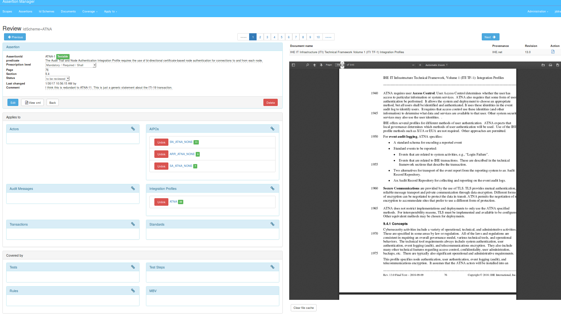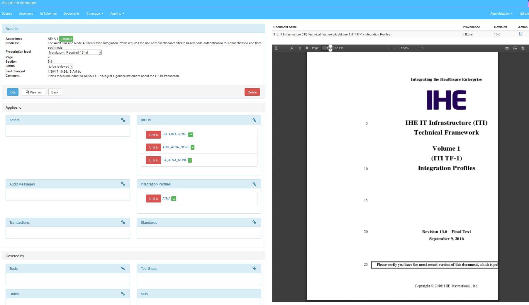 Assertion Manager is the Gazelle tool to handle the assertions that vendors shall respect to be compliant with a profile. Each profile is identified with a unique idScheme, which is associated with a PDF document, the official reference of the profile.