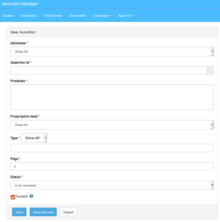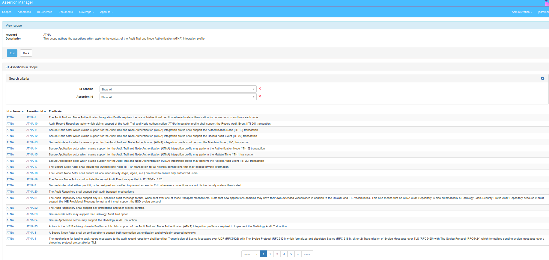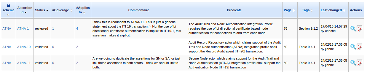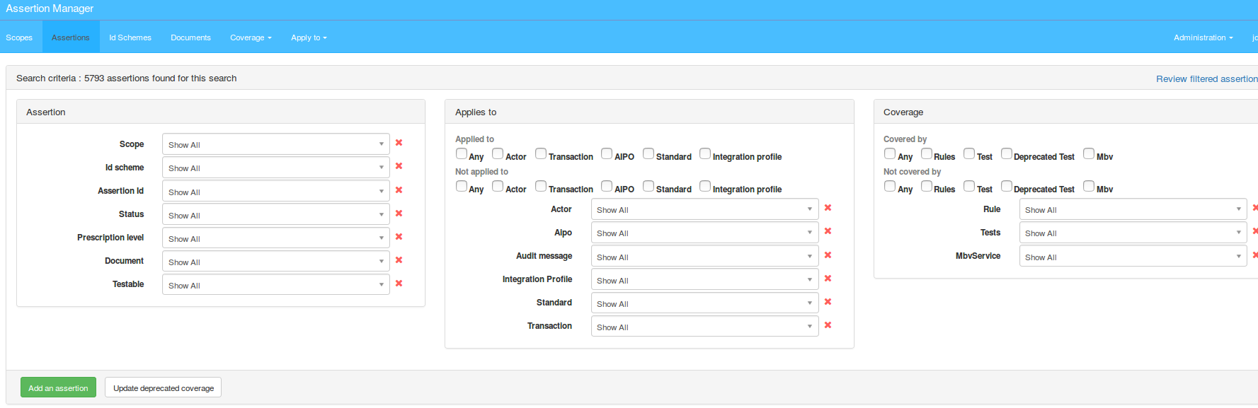 The page displayed lists all registered assertions and the seach criteria area to filter according to Assertion parameters, Applies to and/or Coverage: