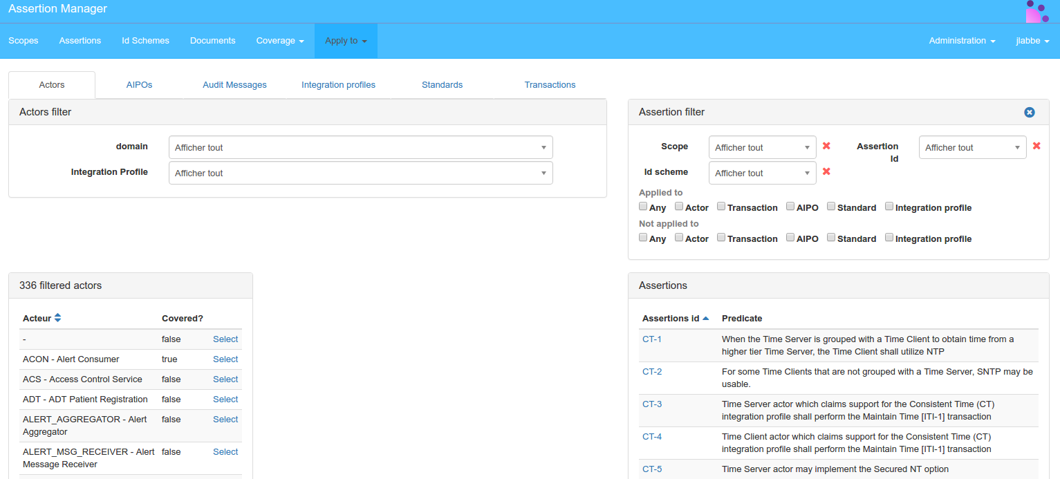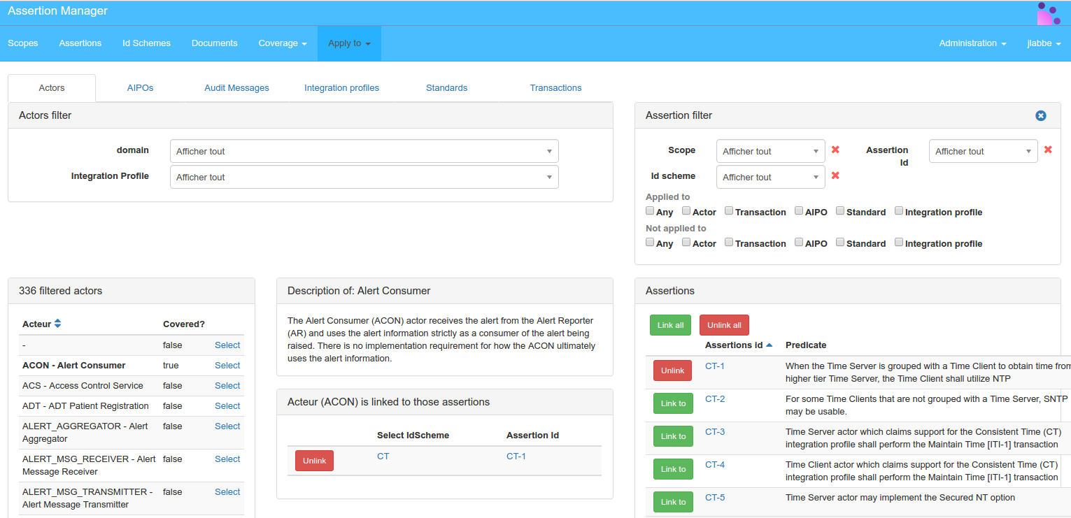 Assertion can be applied to: an Actor, an AIPO, an Audit message, an Integration profile, a Standard, a Transaction. It works the same way for linking all the entities mentioned above, so only one will be demonstrated. Click to ”Apply to” then “Actors” menu link.