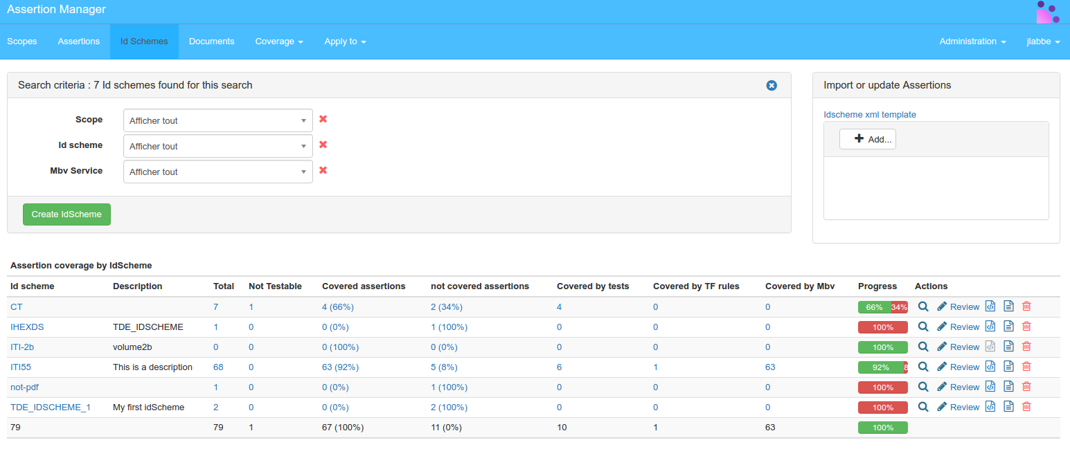 For each idScheme coverage statistics are displayed, and a progress bar to visualize assertion coverage.
