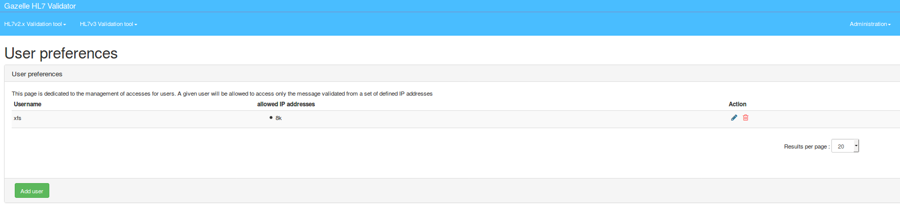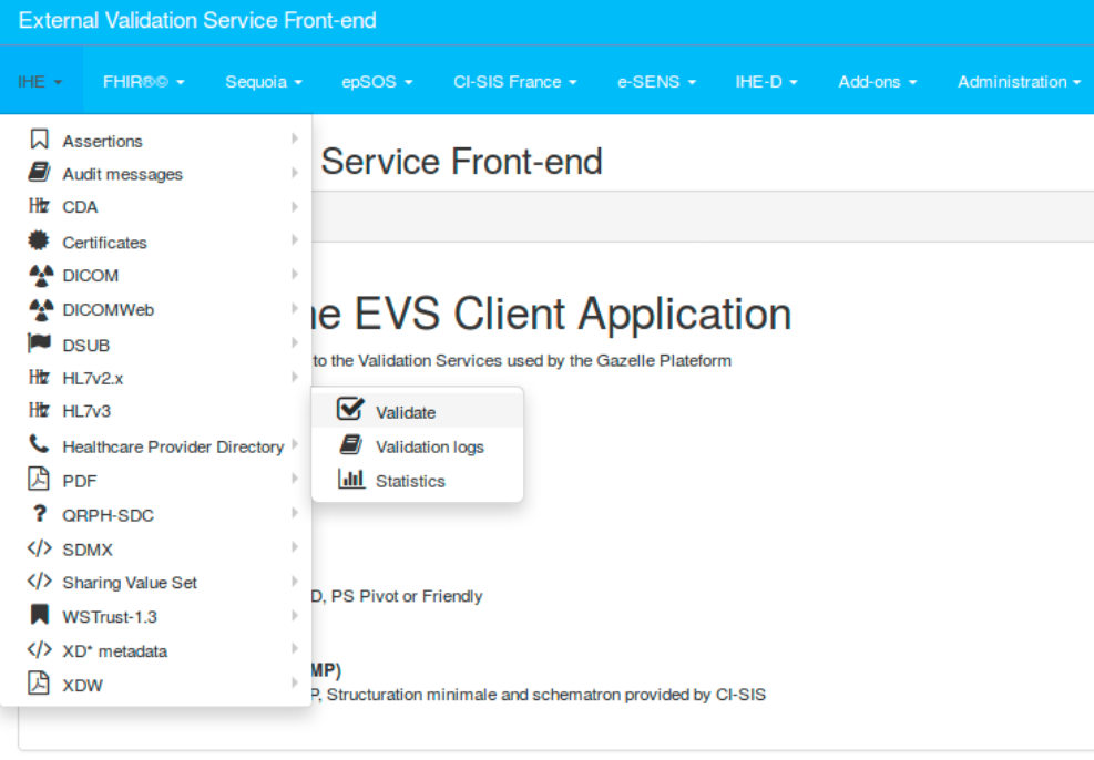 Concerning HL7v2 validation: the application also gathers the HL7 conformance profiles and the HL7 tables (codes) which can be browsed by any user. For each conformance profile, you will find information about its issuer (actor, domain, transaction) and the message type and HL7 version. Each conformance profile can be bound to one or several HL7 tables which gather a list of allowed values for a given field of the message.