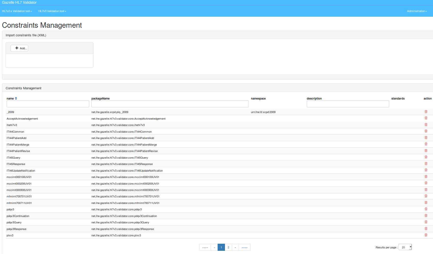 From there, it’s possible to delete individually each HL7v3 constraint by clicking on the button