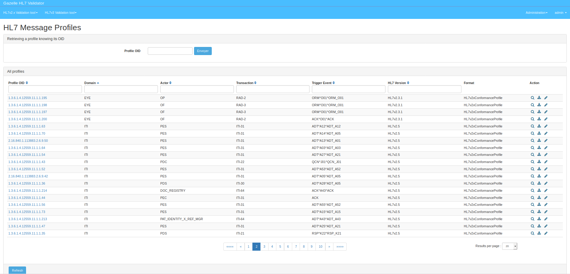 All the HL7 message profiles available are gathered in the tool. You can either select a profile by its full OID (if known) or put filters on the table columns. Each profile is viewable inline and can also be downloaded.