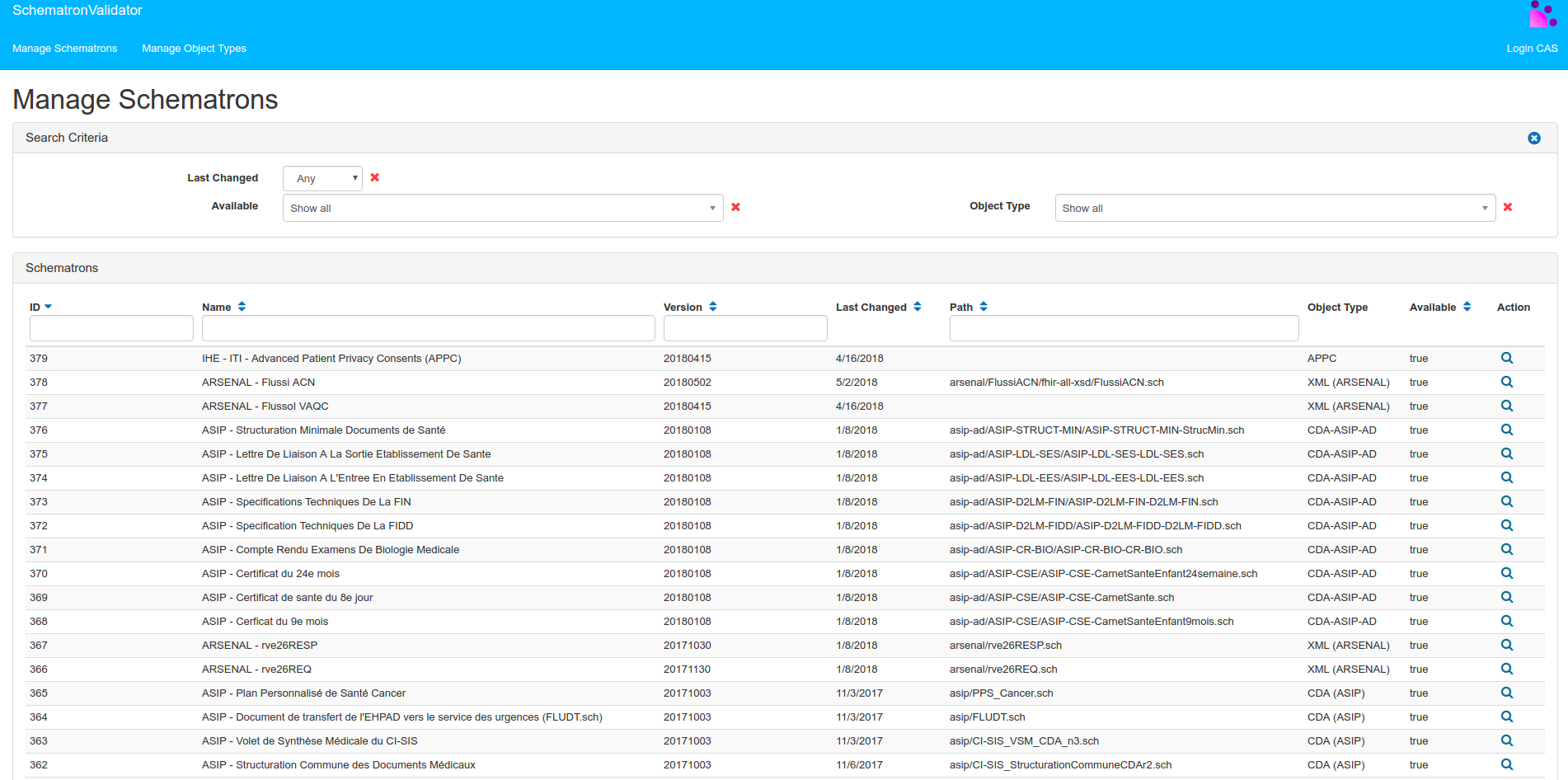 getSchematronForAGivenType : returns the list of schematrons which are linked to the given object type (CDA, HL7v3 …). The value of parameter fileType in getSchematronForAGivenType request, shown below, is available at Object Type Management.