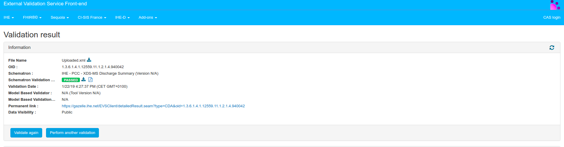 Then, if the invoked schematron is linked to an XSD schema, we check the document is valid according to the schema. If it is not the case, the validation will go on but the result will be FAILED. Concerning CDA documents, we distinguish IHE CDA from epSOS CDA. At XSD validation step, the first ones are validated against CDA.xsd and the second ones against CDA_extended.xsd.